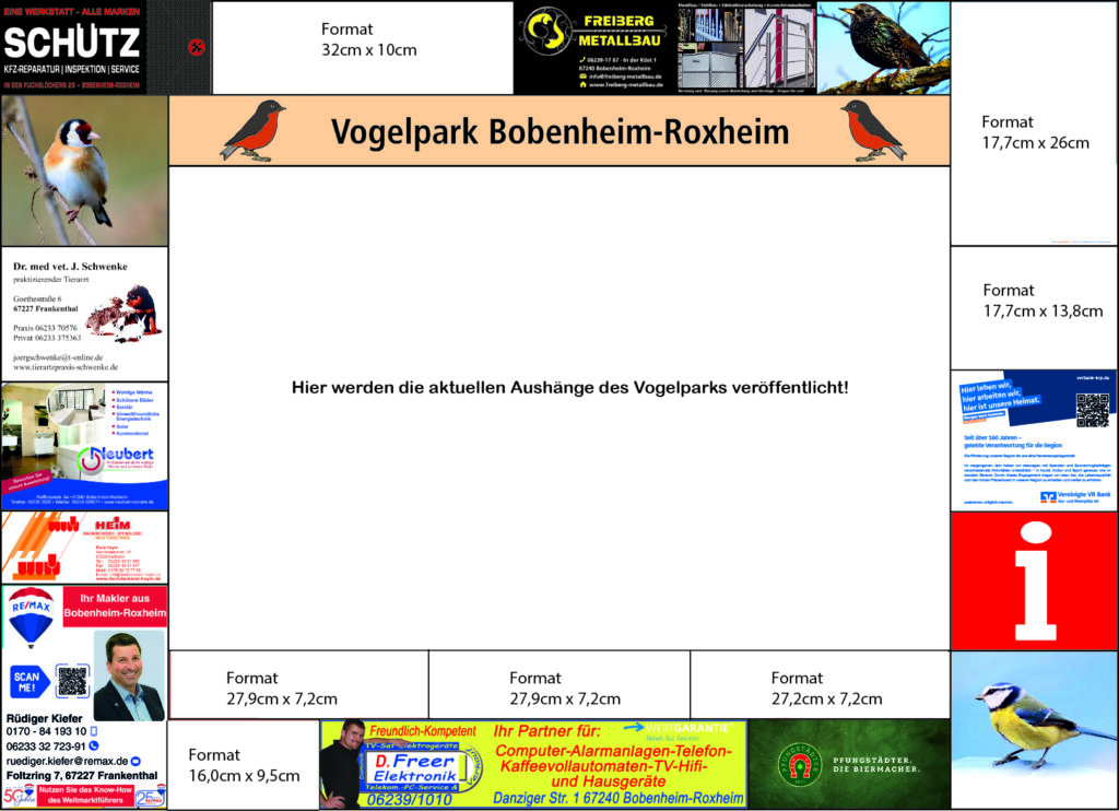 Daher die Bitte: Bleiben sie dem Vogelpark Bobenheim-Roxheim treu und unterstützen Sie mit Ihrer Anzeigenfläche die vielfältigen Aufgaben des Vereins.
